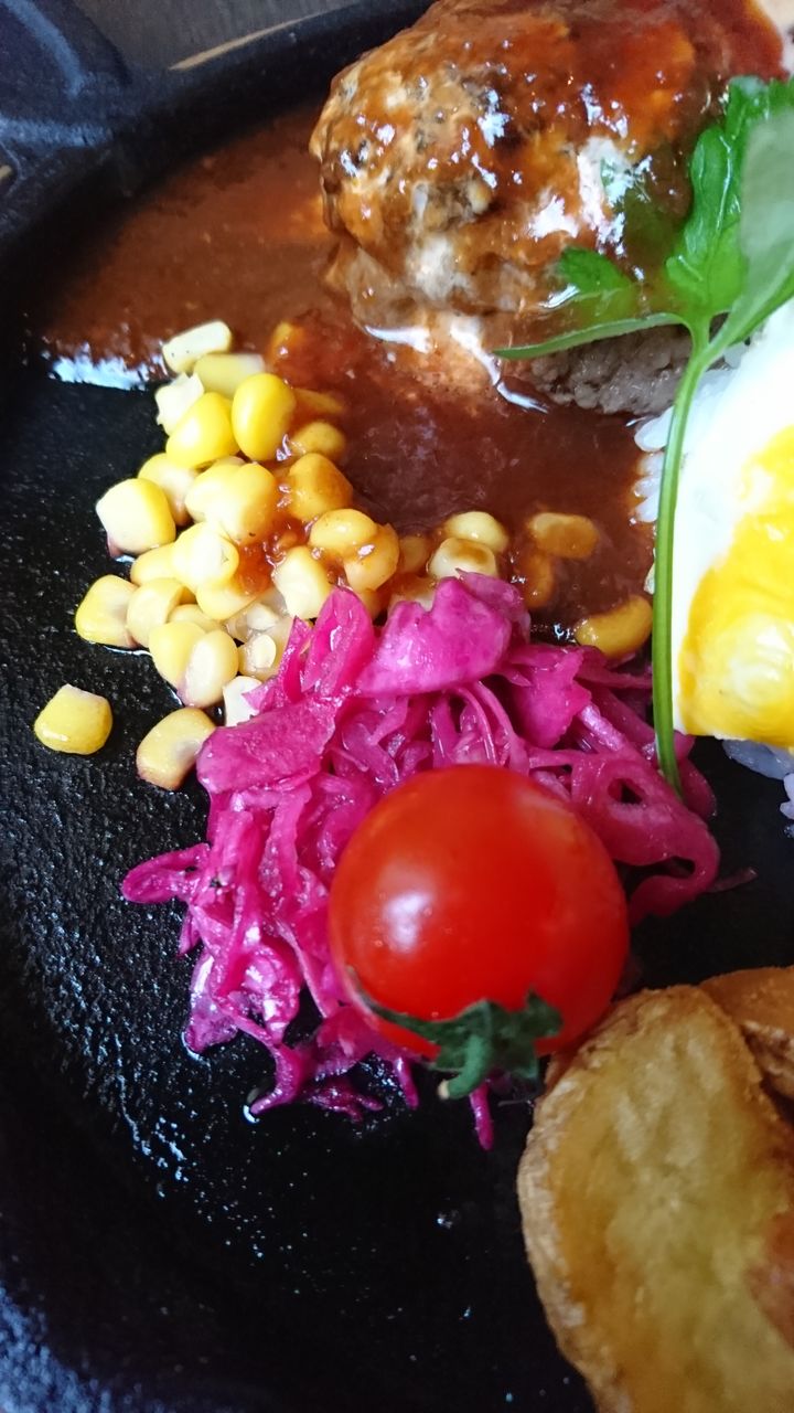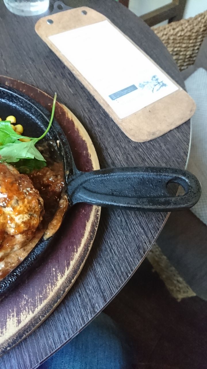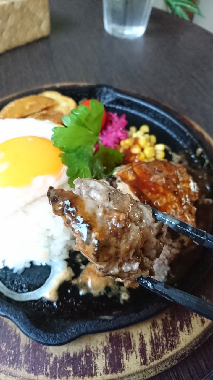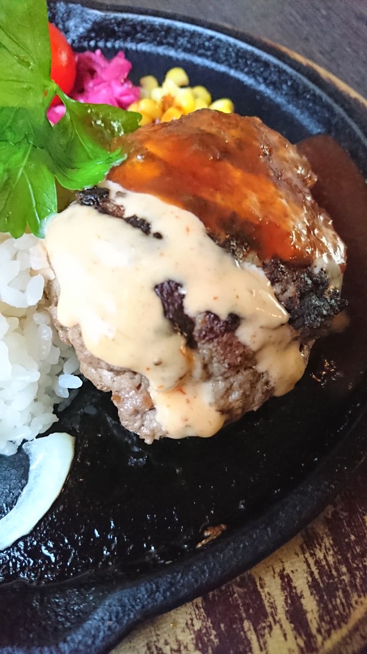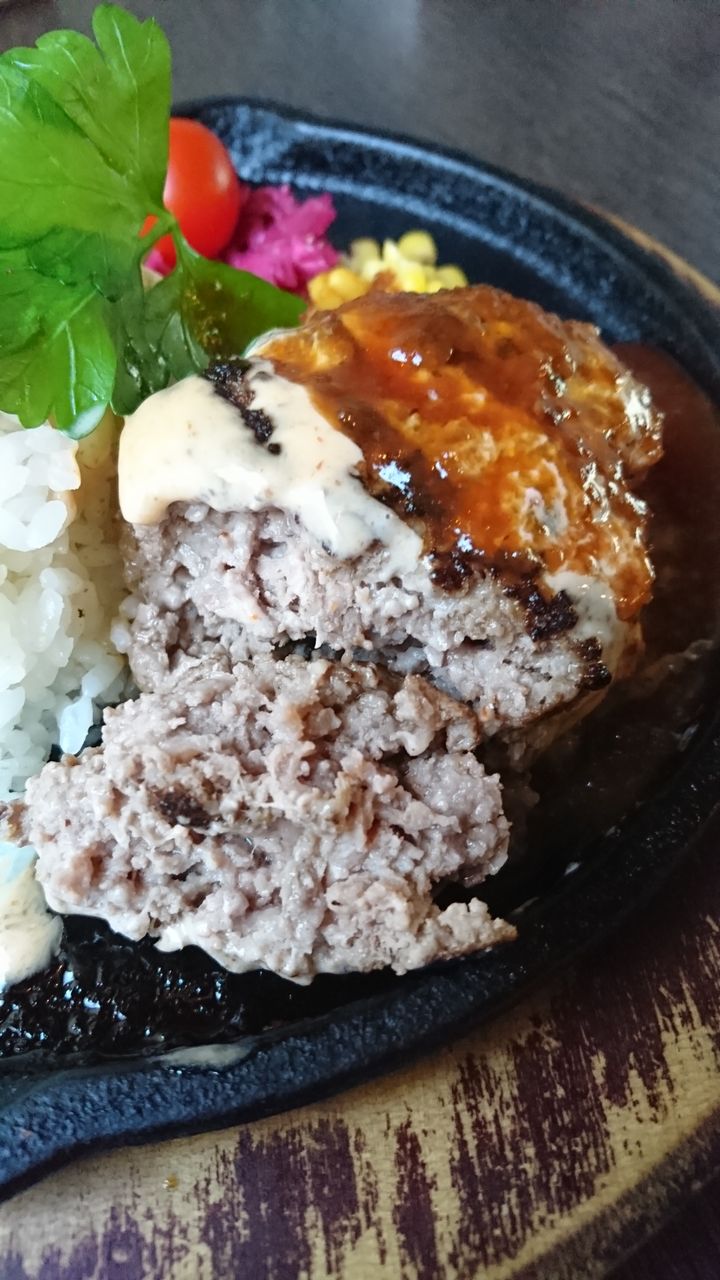 自家製ハンバーグ熱々で美味しそうです。パクリ。